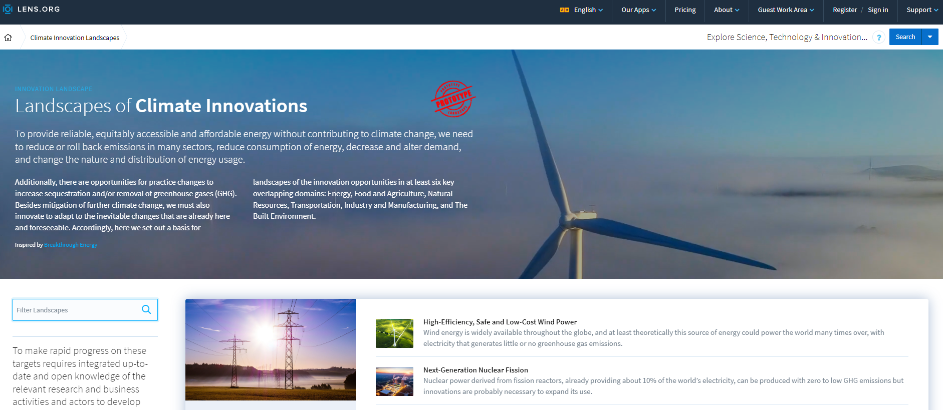 더 렌즈는 과학 기술 관련 학술 논문 전문 사이트이다. 해당 사이트의 매력은 단순 논문 검색 뿐 아니라 과학 기술 관련 다양한 정보를 보기 편하게 얻을 수 있다는 것이다. 특히 눈에 들어오는 것은 기후 변화의 대책을 위한 혁신 기술 관련 페이지이다.
