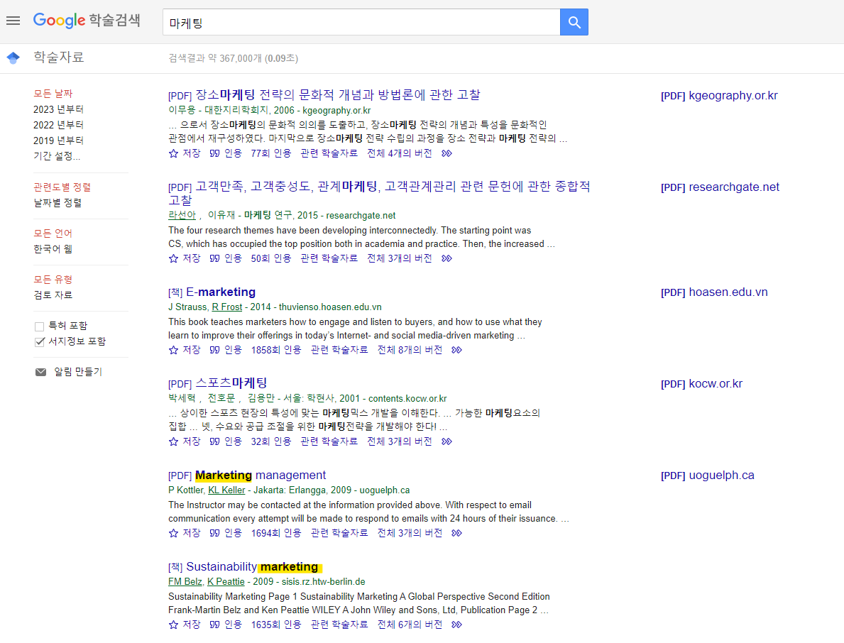 위에 첨부한 화면 캡처본과 같이 한국어 '마케팅'을 검색어로 넣었을 때 'marketing'으로 자동 번역되어 해외 논문도 함께 나온다. 해외 논문은 찾고 싶은데 무슨 키워드를 넣어야 할지 막막한 초심자가 이용하면 좋을 것 같다. 또, 다양한 주제의 논문이 있기 때문에 전공 또는 관심사가 무엇이던 망설이지 않고 활용할 수 있다.